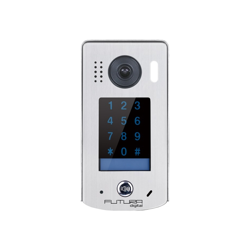 FUTURA 1 lakásos kaputábla, 72° látószögű kamerával, kódzáras, felületre szerelhető, esővédővel. Futura két vezetékes, polaritásmentes kaputelefonhoz. Tápfeszültség: 24V, vandál biztos rozsdamentes acélból, zárnyitási lehetőség: 1 - 99 másodpercig, zárnyitás kimenete: 12Vdc, 300mA relékimenetek száma: 1 ( NO / COM 48Vdc 1,5A ), 90mp beszélgetési idő a beltéri egységből állítható, IP védelem: IP54 , éjjeli LED világítás fényérzékelővel, működési hőmérséklet: -10°C - 45°C, 182x93x28mm