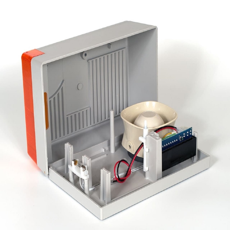 SOLO Sziréna és villogó, kültéri, nyomókamrás, mikroprocesszor vezérelt, szabotázs védett IP34 kettős burkolat (műanyag-acél), kiöntött, teljesen időjárásálló elektronika, negatív v. pozitív indítási lehetőség, lámpa villogtatás, szerviz bemenet, hiba kimenet, 3 perc riasztási idő. Alacsony nyugalmi áramfelvétel, 7Ah akkuhely, 118dB, 180x270x90, 2kg - Tetszetős kialakítású, a hozzá adott sablonnal könnyű szerelni. A tető oldalra nyílik!
