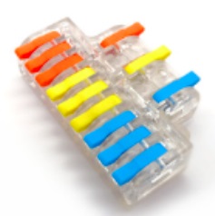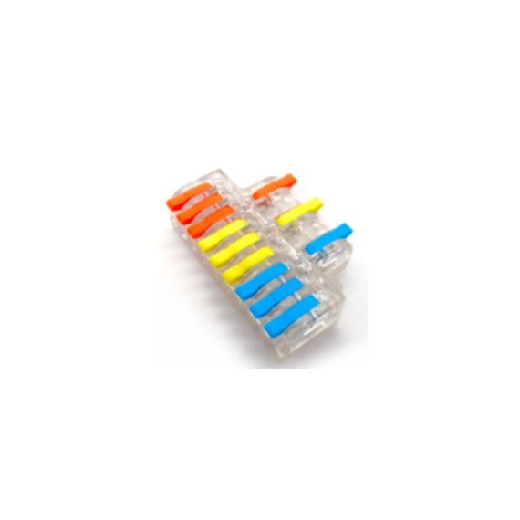 - Színkódolt kapcsok: Az átlátszó ház és a narancs, sárga, valamint kék színű kapcsok segítik a vezetékek könnyű megkülönböztetését és beazonosítását, csökkentve a hibázás lehetőségét.